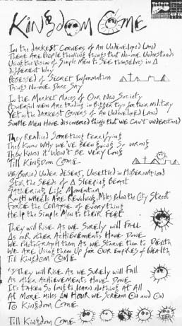 A very upbeat and optimistic track, this is as good as the Dry Land tracks, and would have provided a good contrast on the album. Not so lyrically heavy, it contrasts English winter and summers weather images. The 'steel drum' keyboard sounds, upbeat rhythm and multi-tracked vocals make this a great How We Live track. Steve tells the story behind the song: "It was about a tramp bringing hope and optimism and that the track had to start off in a cold wintry village and end up in the choruses like the Notting Hill Carnival."